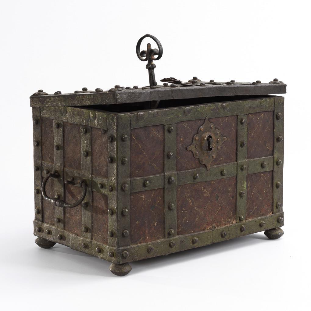 Iron chest standing on pressed spherical feet with riveted hinges and side handles. The front has a mock lock with decorative trim, hinged lid with concealed lock hole. Inside a set-up bar, in the lid an open lock with 2 directional discs as well as 2 schießenden latches and 2 fixed tumblers. Age / signs of use, Bohrlöcher in the lid (missing rivets / appliqués), part riveted new, Lötspuren at the lock.