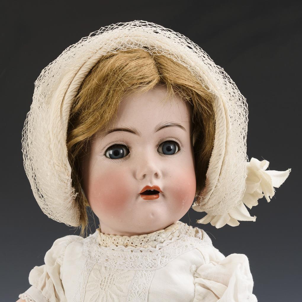 Both with crank head, blue sleep eyes and dark blond wig. The larger one for Kämmer and Reinhardt: 11-piece body with running mechanism. L 63 cm. The smaller one for Wiesenthal, Schindel & Kallenberg: 15-piece articulated body. L 55 cm. Both with bright clothes, hood and white leather shoes. Running doll with small, glued breakout at the crown of the head, 1x hands repaired.