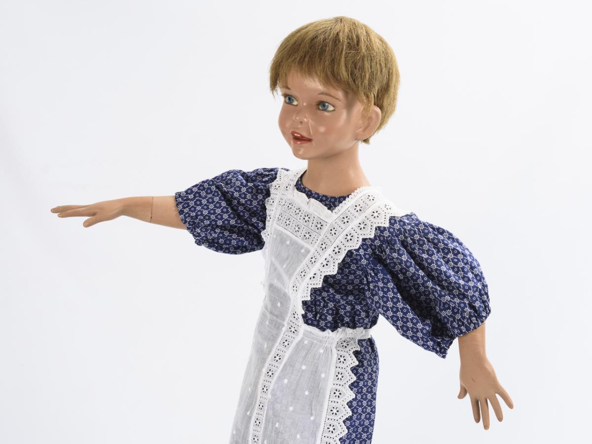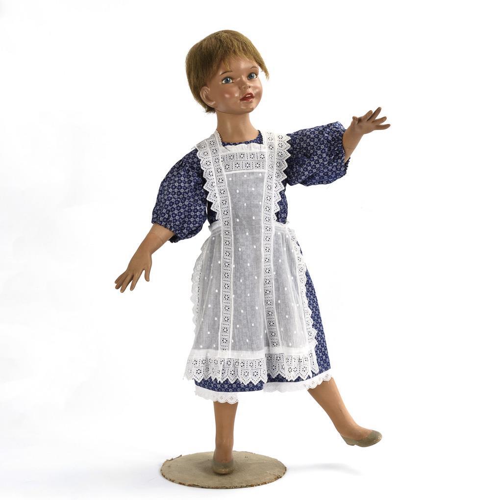 Decoration figure as a ca. 4-year-old girl with blue eyes, blond hemp wig, blue print dress and white apron. Torso, hands and left leg removable. On original stand. Slight signs of age and wear.