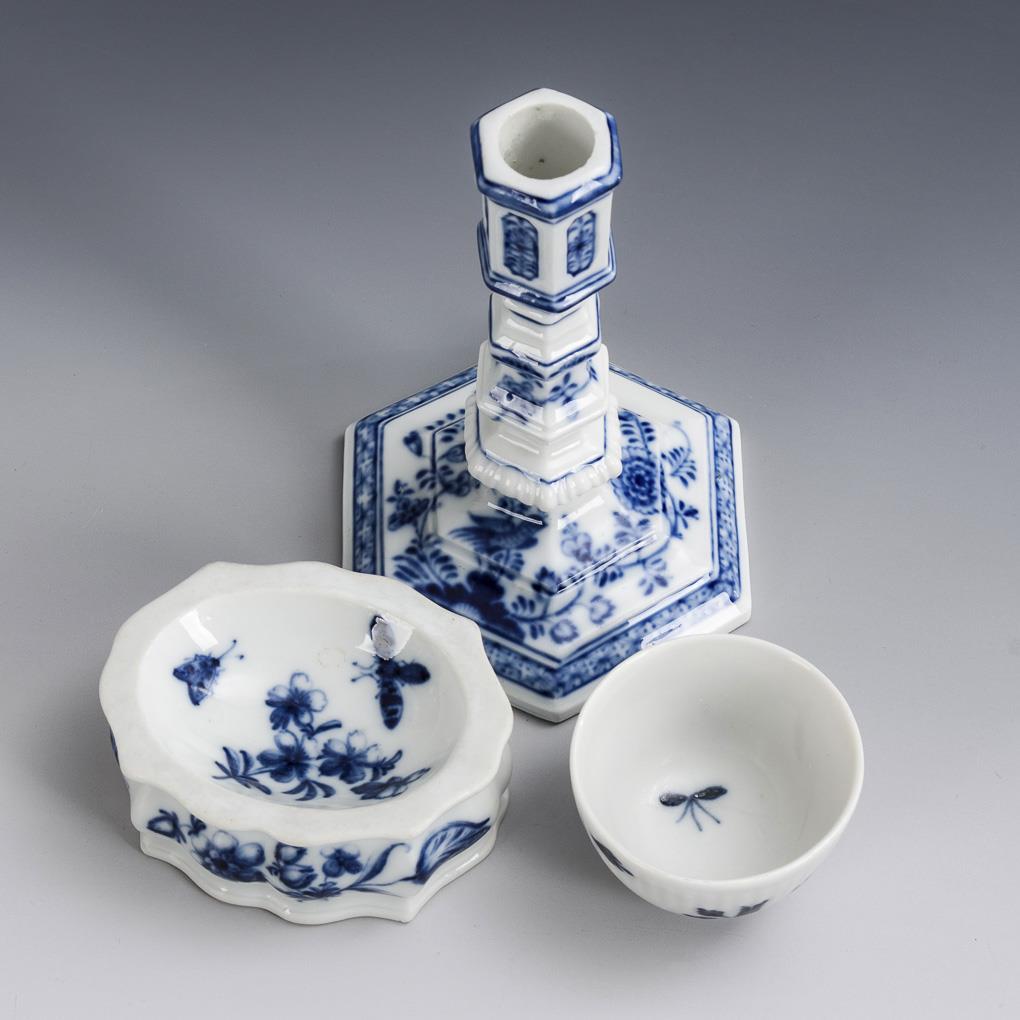 1x knob swords, from 1850-1924, 1st choice: hexagonal candlestick with rock and bird painting (h 13 cm). / 1x sword mark, 2nd half of 18th century: oval saliere with flower and insect painting (l 8,5 cm). / 1x Sword mark with dot, 1763-1774: cooper with broken ribbed wall and floral painting (h 3,5 cm). Saliere rim and cooper restored.