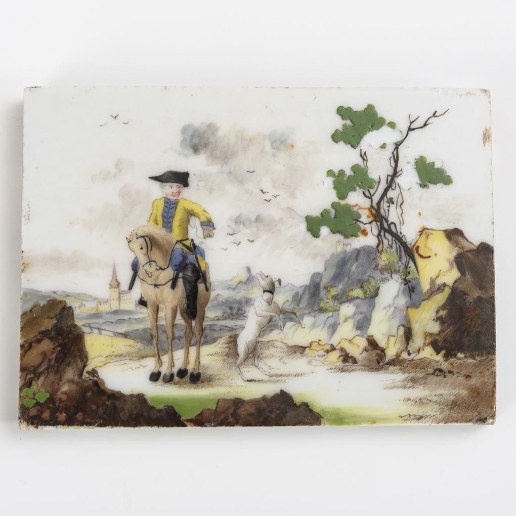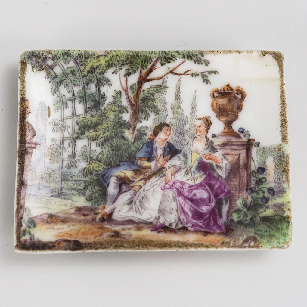 1x small rectangular, slightly domed plaque with watteau painting on both sides (3,6 x 4,8 cm; insert for a tabatine lid). / 1x Meissen: rectangular plaque depicting a rider in a landscape (6.8 x 9.3 cm). 1x with paint chipping and 2 edge chips.