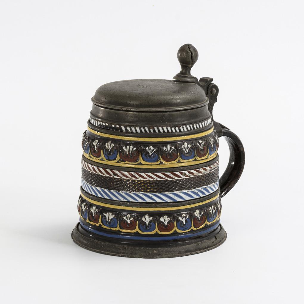 Conical cylindrical jug with ribbon handle, central circumferential narrow scale band, beaded leaf friezes, striped rims. Pewter lid with spherical notch, engraved "JTW", hallmarked inside (Prague). Wall and base cracked, partly punctured and glued, pewter mounting with defects.