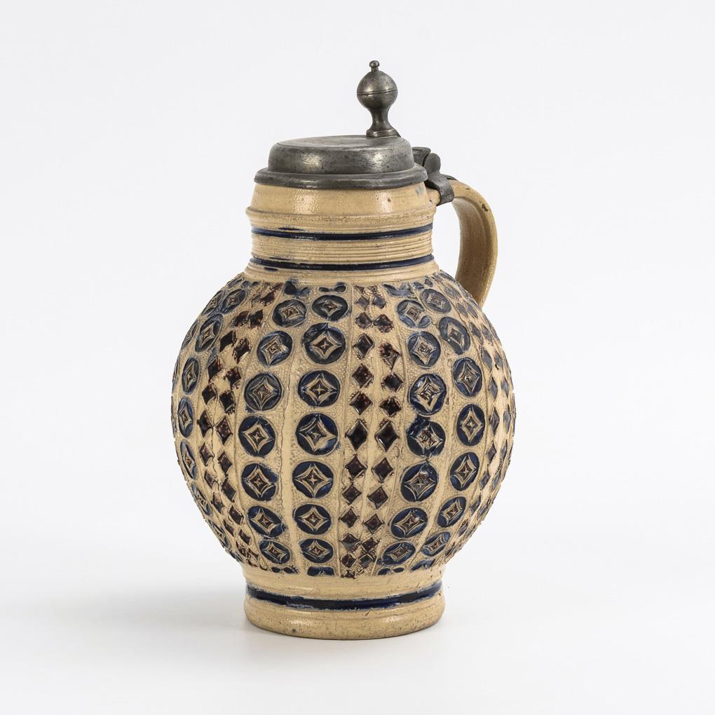 Sphere body with vertical decorative bands, neck with cross grooves, ribbon handle with inverted handle base as well as stepped stand. Pewter lid with ball pusher, engraved "GSK". Slight signs of age and use, handle cracked and restored, short hairline crack on the stand.