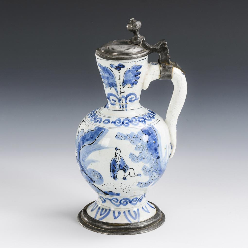 Sphere-bellied jug with funnel-shaped narrow neck and stepped round foot, spiral decorated beaded handle. Circumferential Asiatic figures in sketched landscape. Pewter lid with ball pusher. Signs of age and use, restored at the handle and stand.