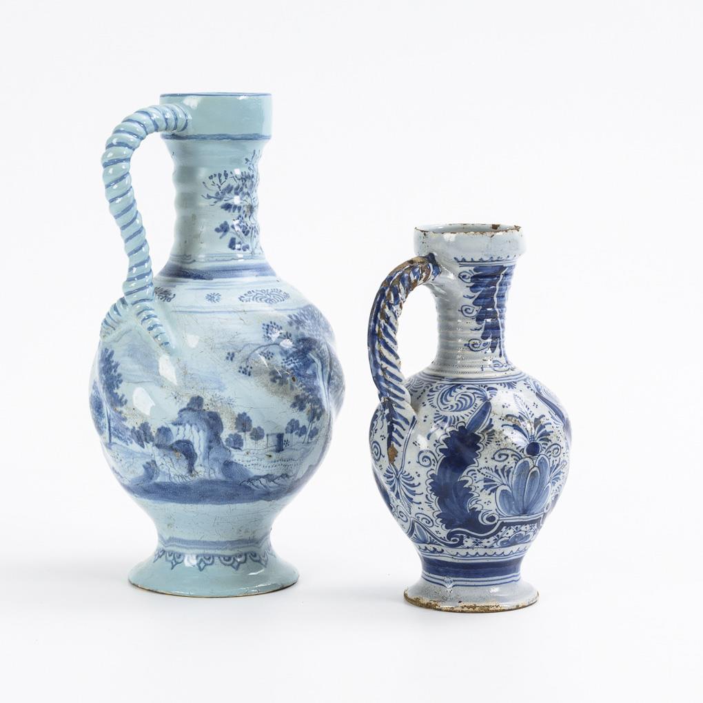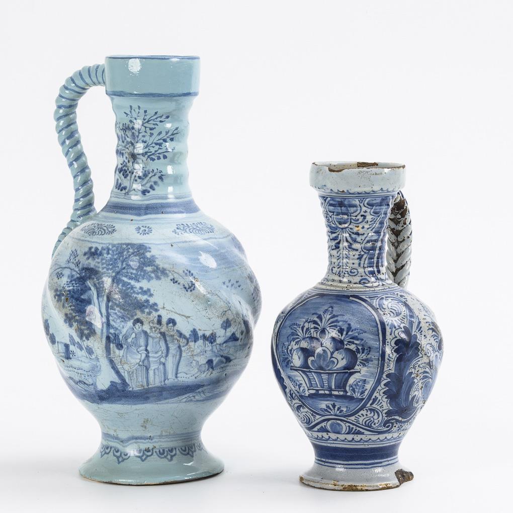2 baroque faience narrow neck jugs with blue painting. Southern Germany.