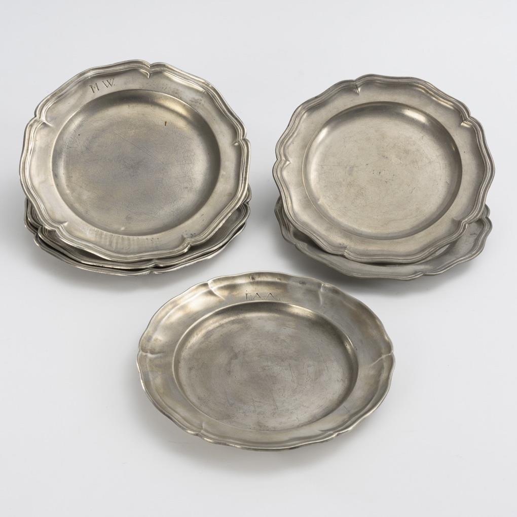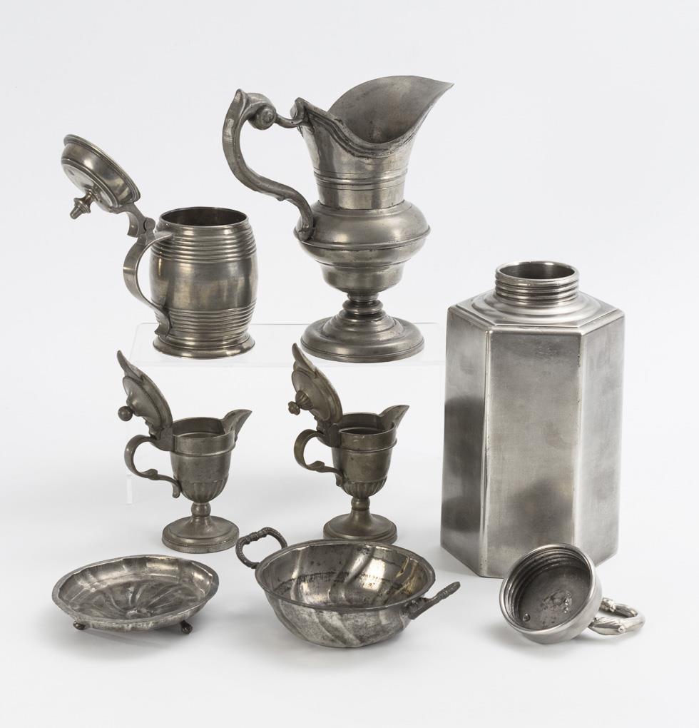 Hexagonal screw top jug with dolphin carrying handle. / Helmet jug. / Barrel shaped lidded tankard. / Pair of cruets. / HRF hallmarked small midwife bowl monogram "AS" engraved. / 6 plates, including 5 similar, 2 of which are hallmarked the same. Signs of age/use, few solder repairs.
