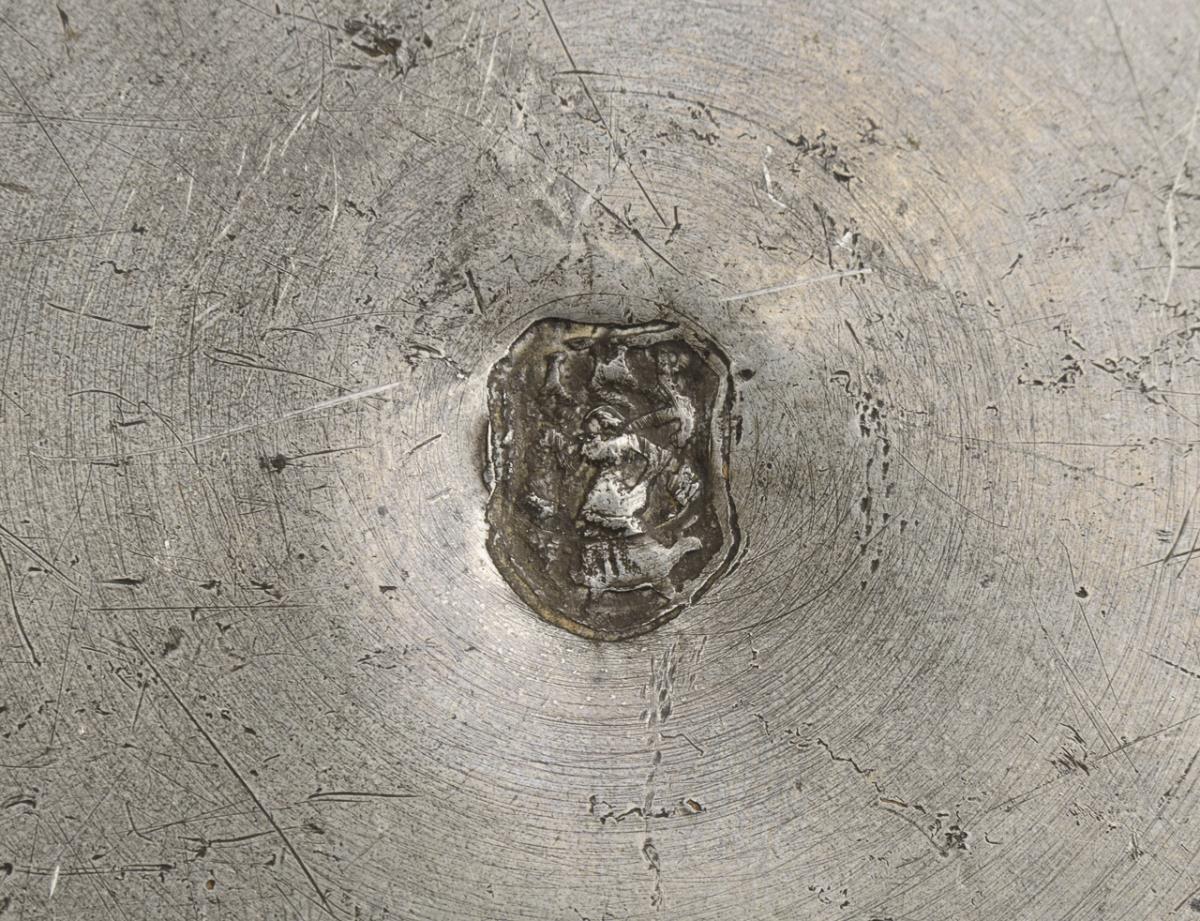 Baroque plate with central resurrection scene; on the flag 12 cartouches with the apostles. / Indistinctly hallmarked historicism plate with central resurrection; on the flag relief medallions with the emperor and 6 electors with their coats of arms. Baroque plate dented, mirror edge somewhat scratched, 2 hairline cracks on the flag edge. Historism plate with deposits in the relief depths, minimally scratched and dented.