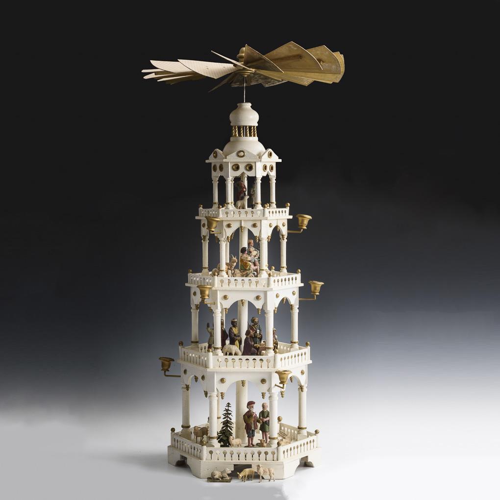 In white; and gold lacquered Erzgebirgs step pyramid with 4 revolving floors, 9 candles and großem Flügelrad with signs of age (H ca 120 cm). In addition Konvolut 10 carved nativity figures (probably Böhmen), 2 Schäfer, 14 sheep, 1 dog and 3 Bäume (H 2.5 - 13.5 cm). Traces of age, small defects. Pyramid repainted.