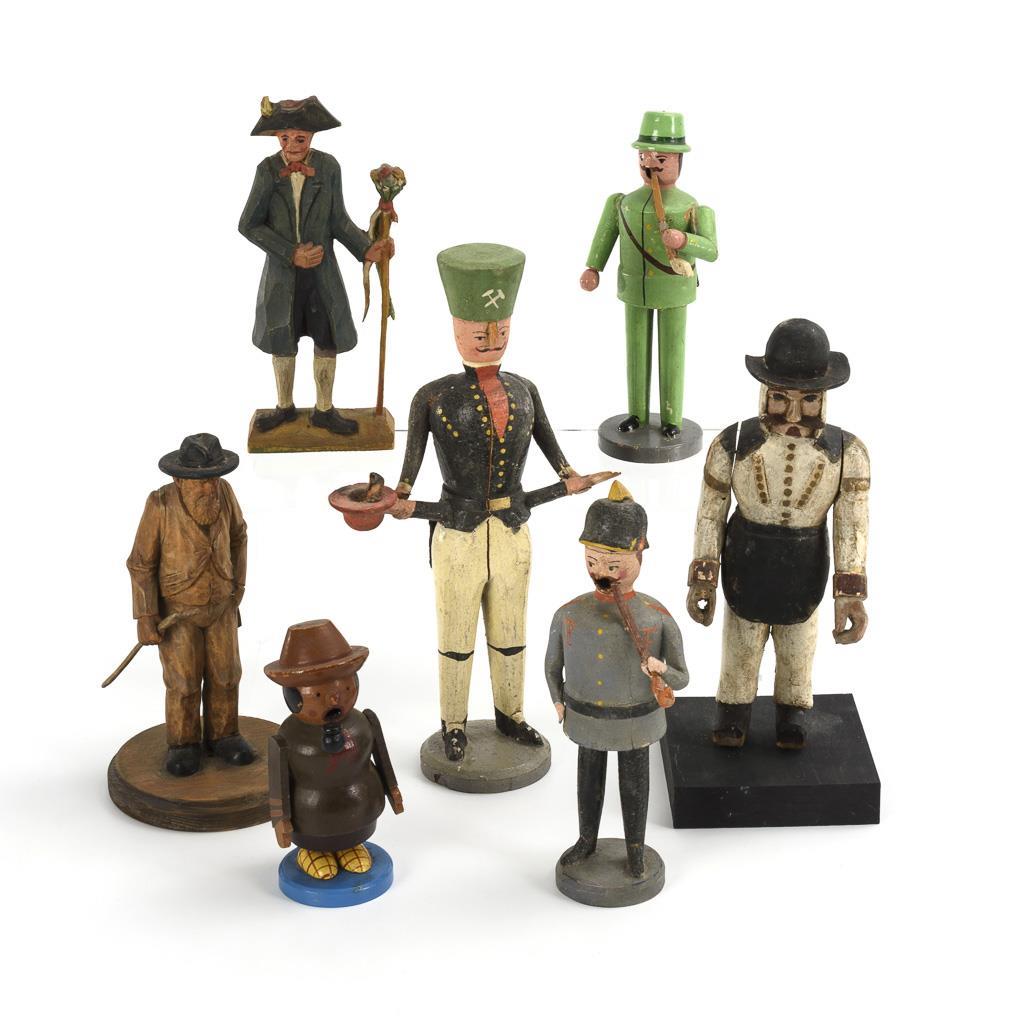 7 wooden figures, including 3 Räuchermännchen. Mostly Erzgebirge.