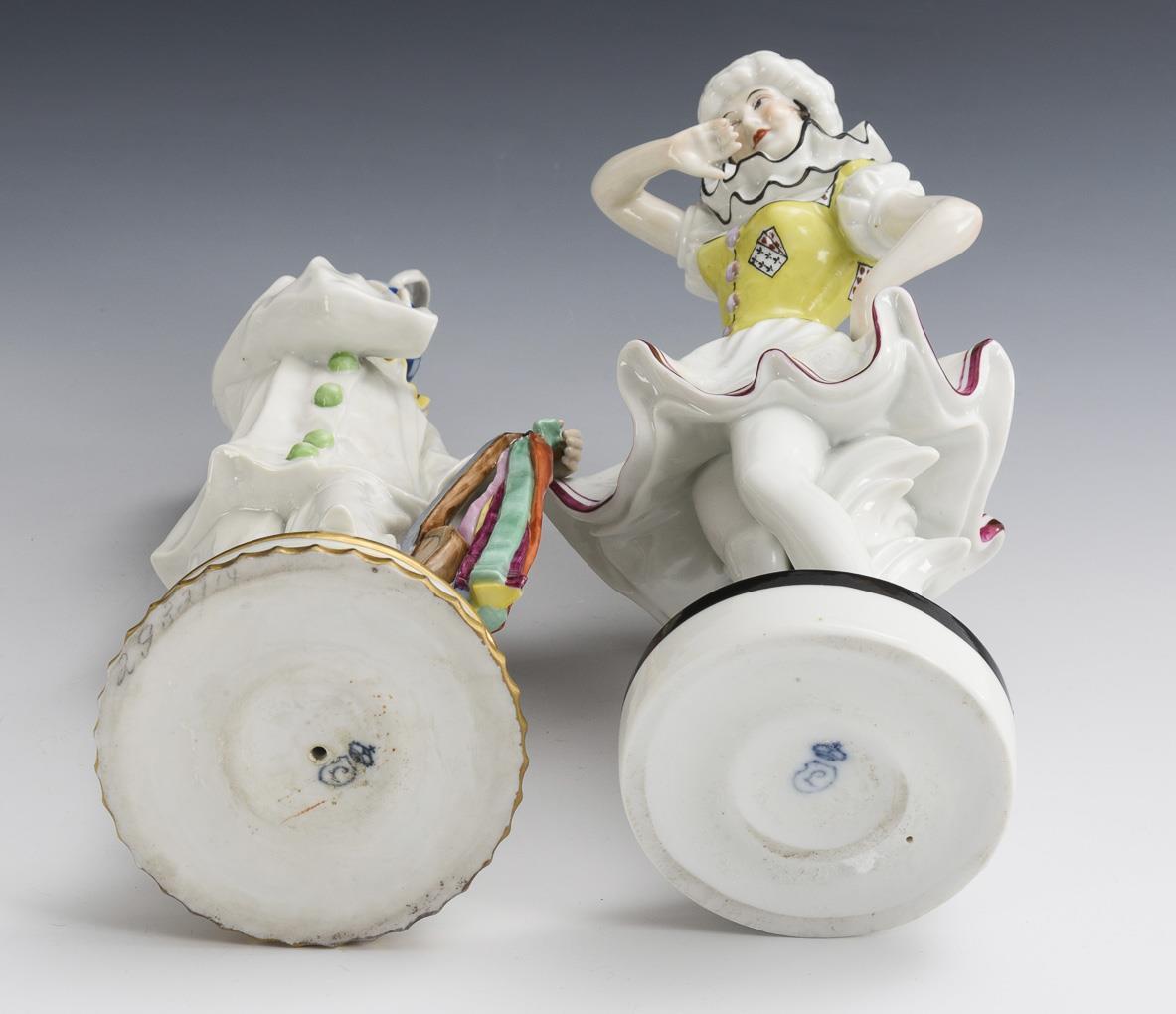 1x harlequin with guitar and 1x pierrette with pointed hat. Neck of harlequin restored.