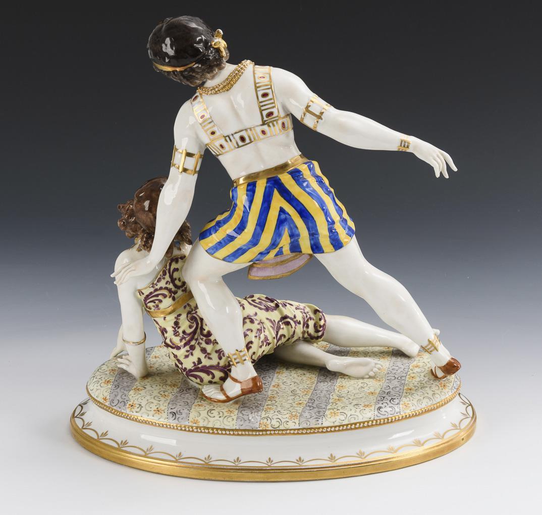 Expressive sculpture of the dancer Michel Fokine and the dancer Vera Fokina in a scene of the ballet "Cleopatra". 1 thumb and 1 hand restored, minimal gold abrasion.