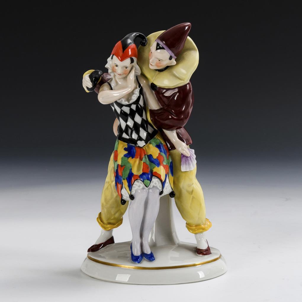 The Colombine embracing harlequin. 2 small glaze chips on the right arm of the harlequin.