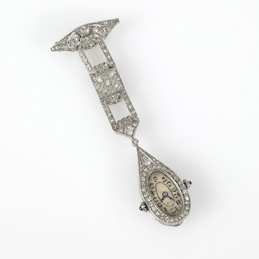Diamond-set multi-jeweled mille-handle brooch and suspended watch with Arabic numerals, feather crown and dazzler crown with sapphire cabochon. Sliding hook, movement runs. Dial partially tarnished.