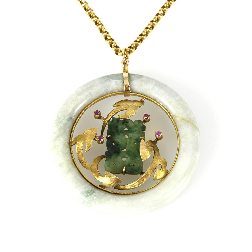 In jade ring mounted gold ornament, small jade plaque and 4 small chaton set rubies, on pea chain with ring spring clasp.