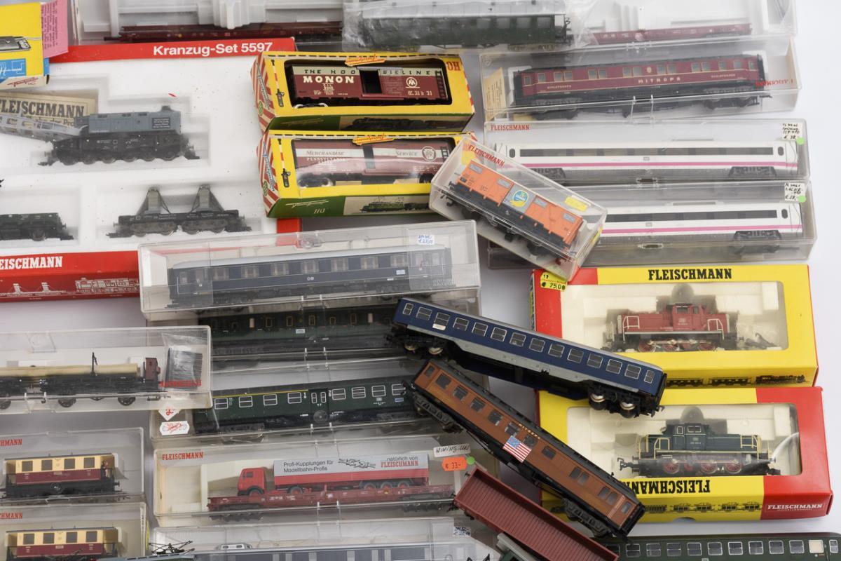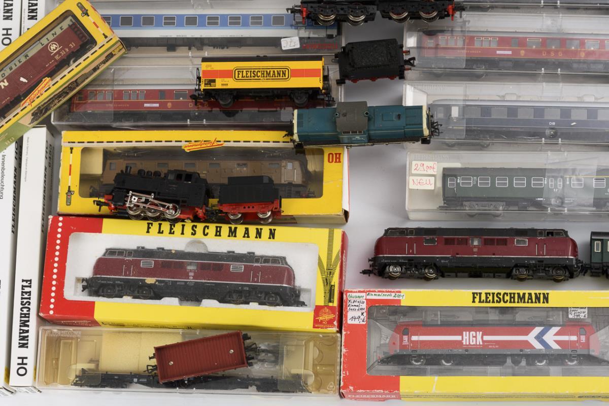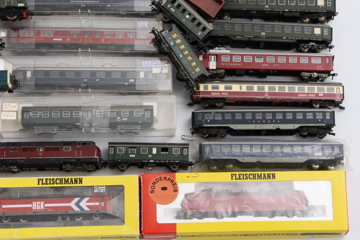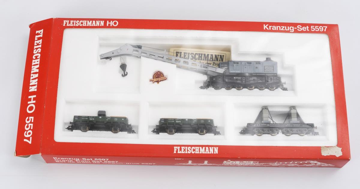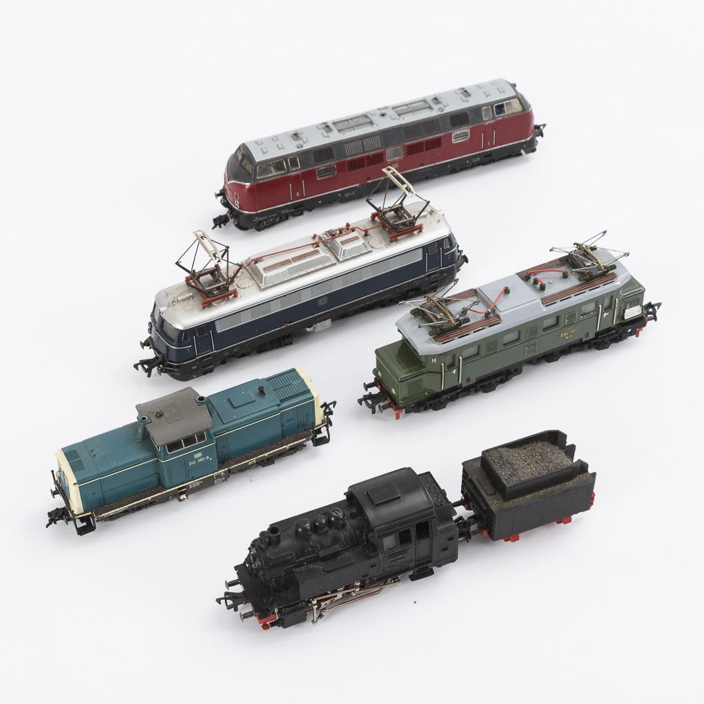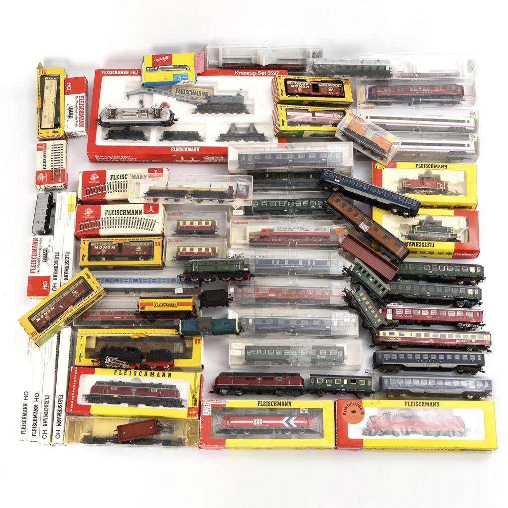 H0 gauge. Extensive collection, some in original boxes. Including crane train set 5597, approx. 7 locomotives, approx. 44 cars and 10 boxes with accessories (including tracks and interior lighting). Function not tested. Played, small defects.