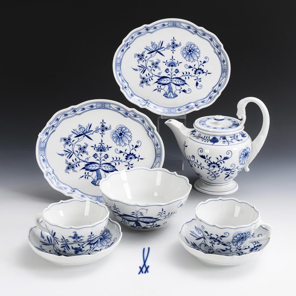 Onion pattern pot, -comb, 2 -cups and 2 trays. Meissen.