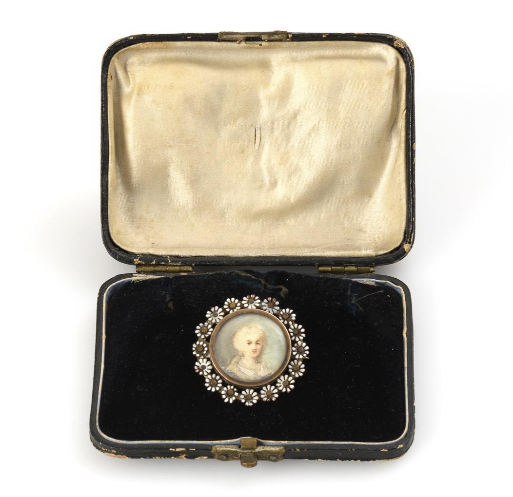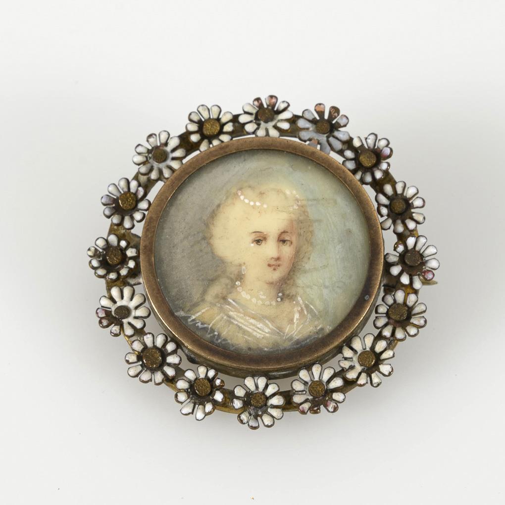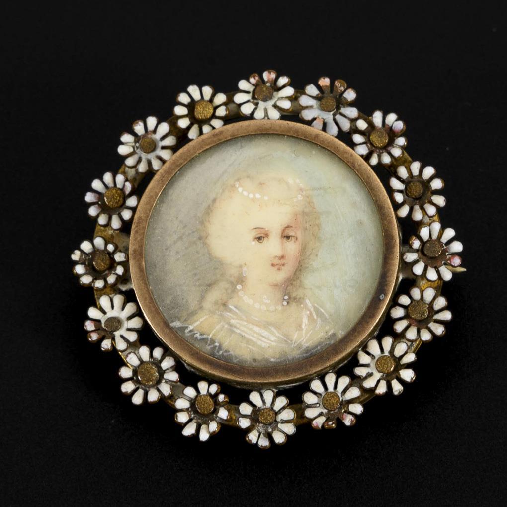 Framed glazed painted miniature with portrait of lady surrounded by movable mounted enameled flowers. Hook closure. Partial enamel blemishes.