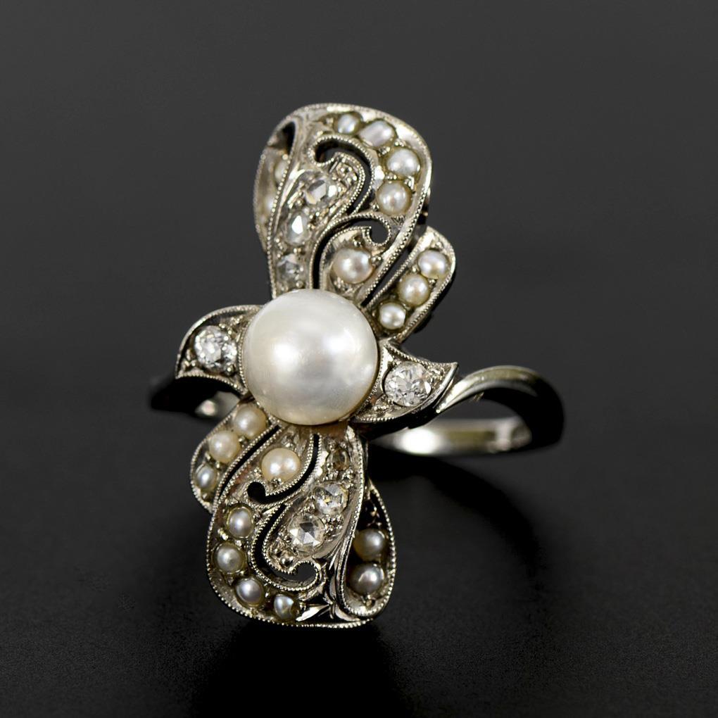 Mille handle ring head with cultured pearl, seed pearls and diamond roses, between narrow rail.