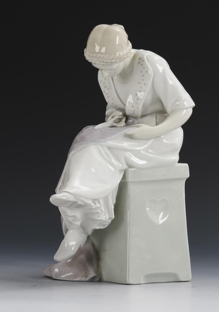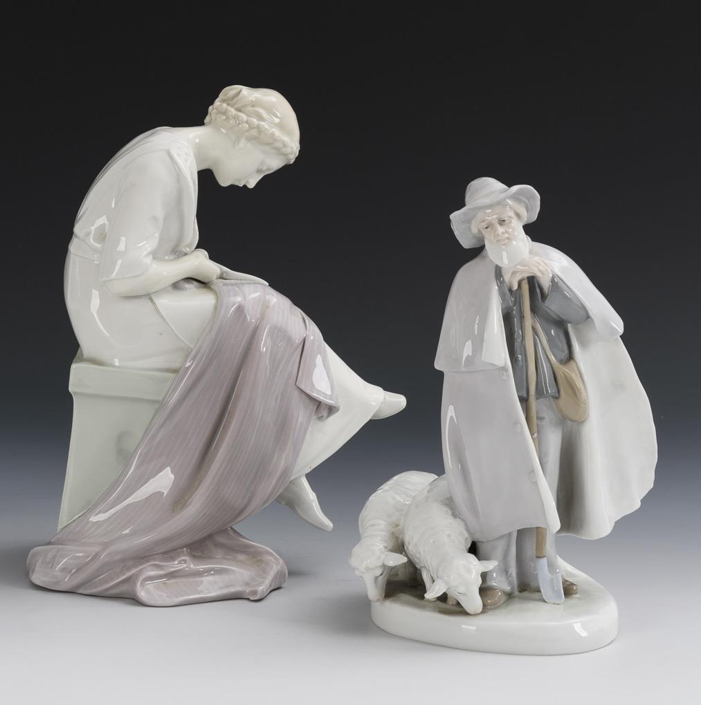 1x Heubach, square mark from 1909, model no. 8809, design 1911/13 by Wilhelm Neuhäuser (1885-1960): woman sitting on a stool, cutting a piece of cloth (h 22.5 cm). / 1x Metzler & Ortloff, c. 1900: Standing shepherd with two sheep (h 20 cm). Small bump on the shepherd's crook, 1 sheep ear missing.