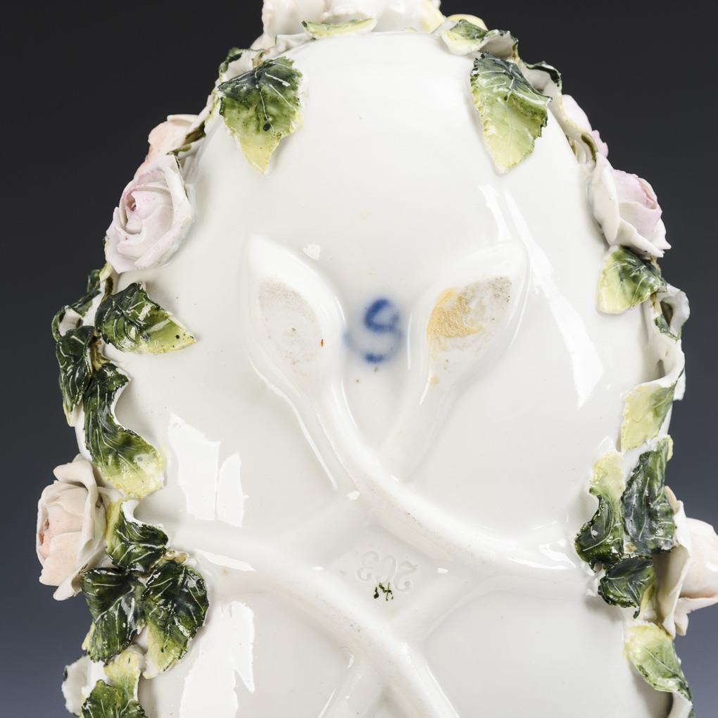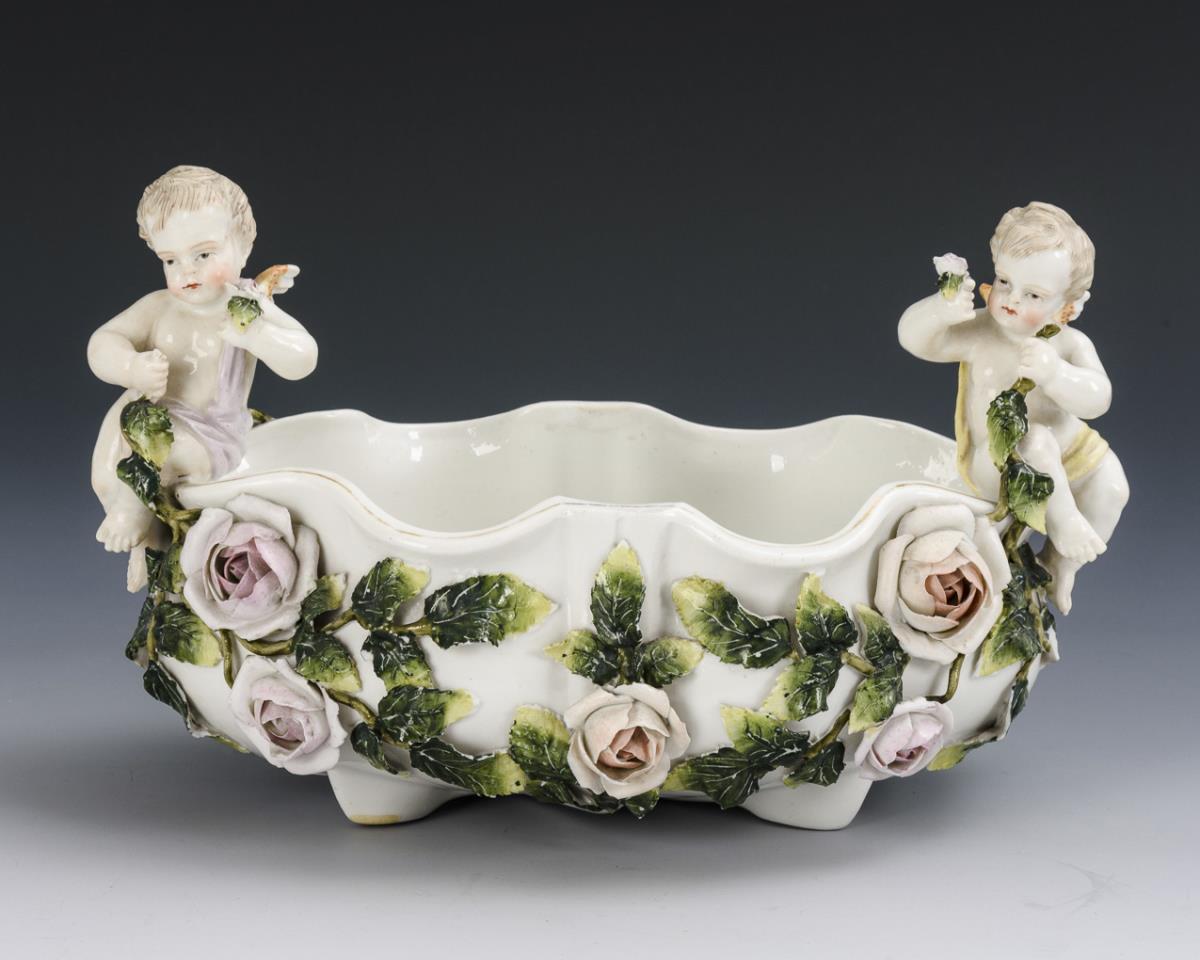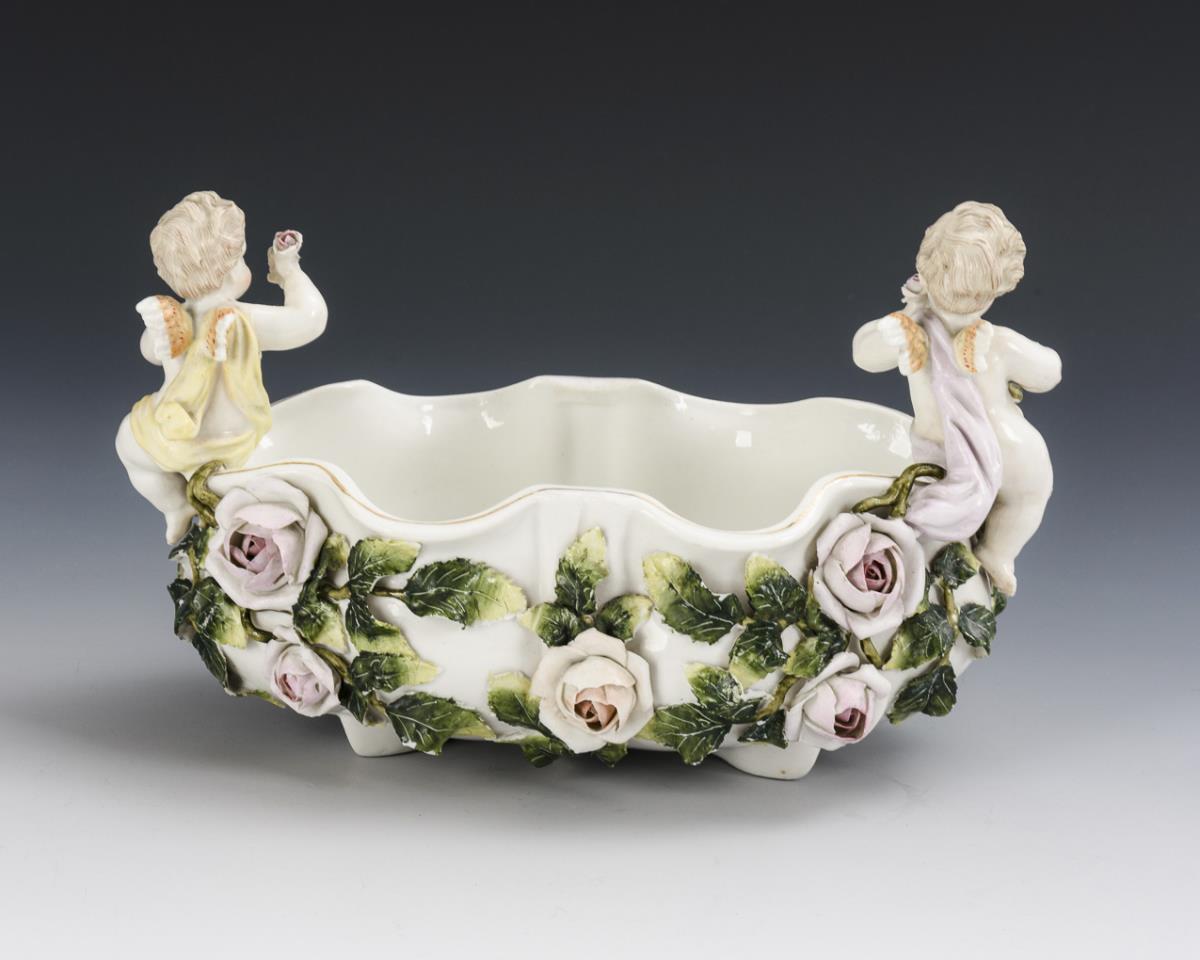 Oval bowl covered with rose vines with two putti sitting on the rim. Damages to the coating.