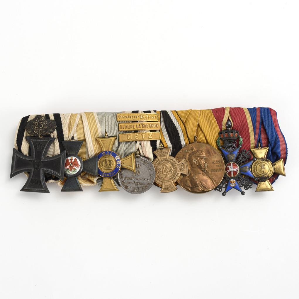 No. 1: Iron Cross of 1870/71 for non-combatants and 25th anniversary clasp /. No. 2: Red Eagle Order (under 3rd class) / No. 3: Royal Order of the Crown 4th class) / No. 4: War memorial coin 1870/71 with clasps: "Cravelotte St. Privat; Beaune la Rolande; Metz" / No. 5: Commemorative cross for 1866 / No. 6: Kaiser Wilhelm I commemorative medal, 1897 / No. 7: Ducal Brunswick Order of Henry the Lion, metal variant / No. 8: Oldenburg House and Order of Merit Cross of Honor 1st Class.