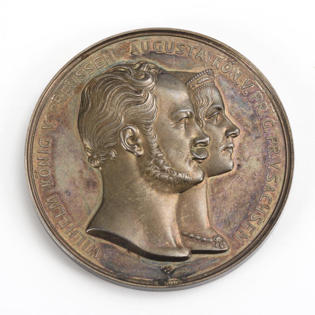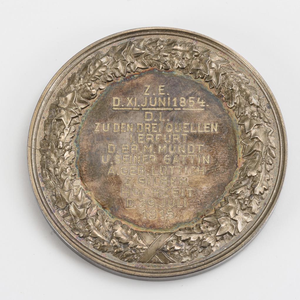 Obverse bust portrait of Wilhelm I and Augusta with circumscription "Wilhelm König v. Preussen Augusta Kön. v. Pr. G. Pr. Sachsen", on the edge signature of the stamp cutter. Reverse in oak/ivy wreath engraving by the lodge "Zu den drei Quellen" in Erfurt to commemorate the silver wedding anniversary of M. Mundt and his wife A. 1915. Somewhat tarnished, minimal traces of cleaning.