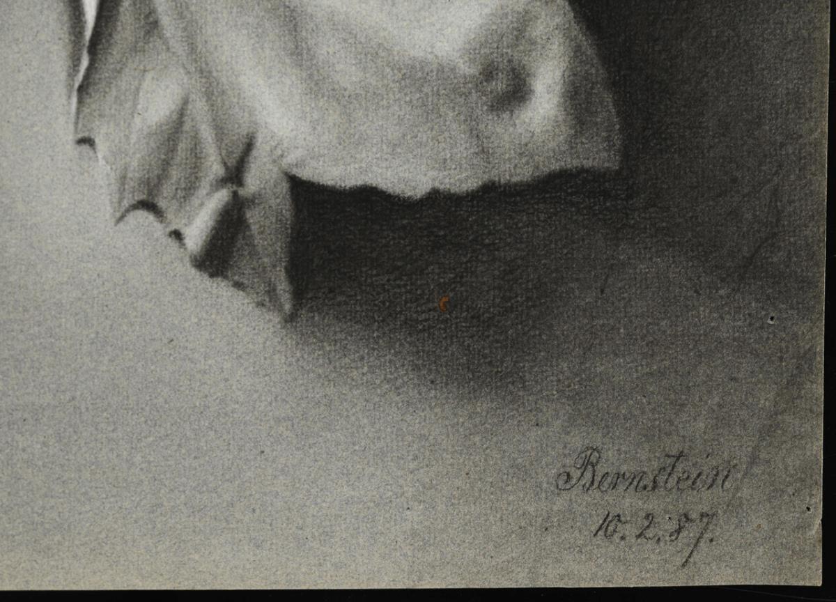 Coal drawing with white enhancement. Charcoal signature. Dated: "10. 2. [18]87".