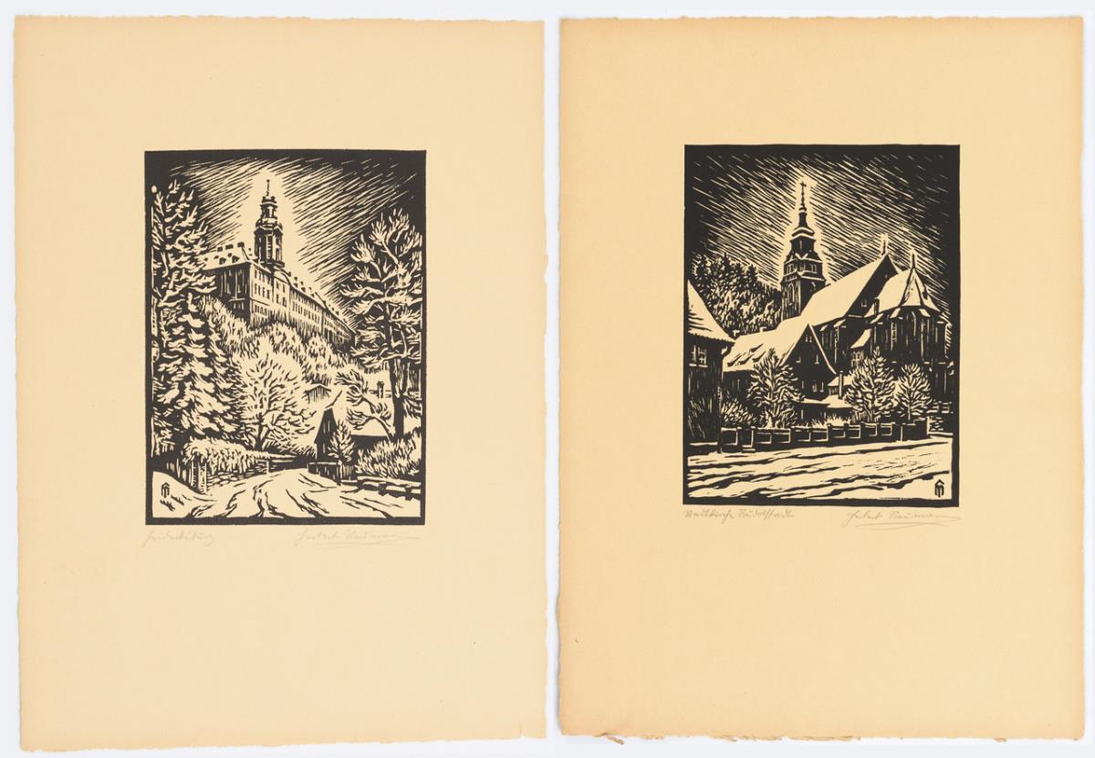 2 woodcuts. Each with pencil signature.