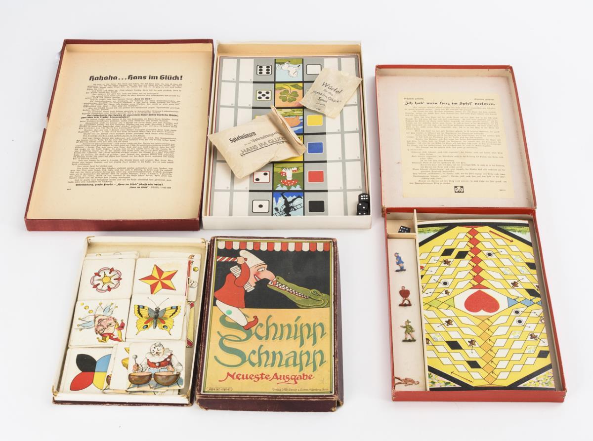 "Schnipp Schnapp. Latest Edition". Publisher J.W. Spear & Sons, Nuremberg. / "I lost my heart in the game!" Klee-Spiele, Fürth. / "Hans im Glück." Publisher unknown. Good condition, probably complete. Cartons with small defects.