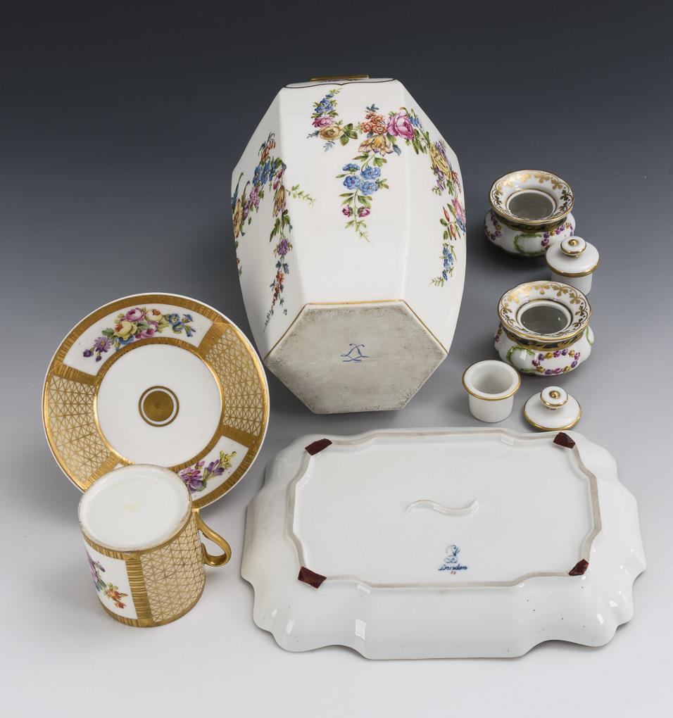 1x imitation Sèvres mark: hexagonal baluster vase with floral painting (h 21,5 cm). / 1x POTSCHAPPEL: writing bowl with two inkwells and floral painting (15,5 x 21,5 cm). / 1x unmarked: cylinder cup (H 6.5 cm) with original saucer (Ø 12.5 cm) and floral painting. Partial gold abrasion.