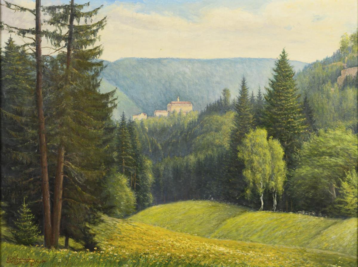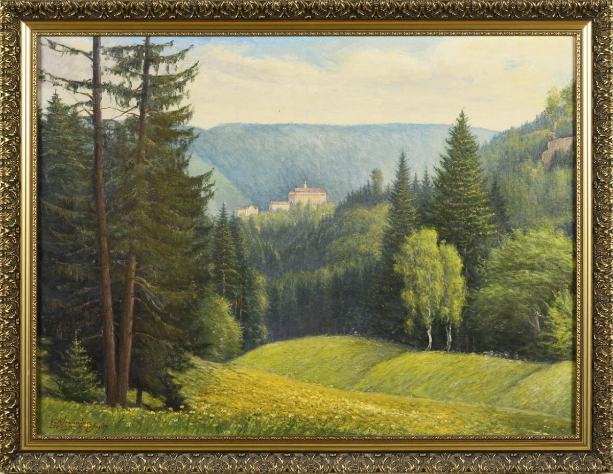 Bright sunshine over the blooming meadows and the dense forest around the Thuringian Castle. In addition, verso attached the original sales card of the painter. A small defect.