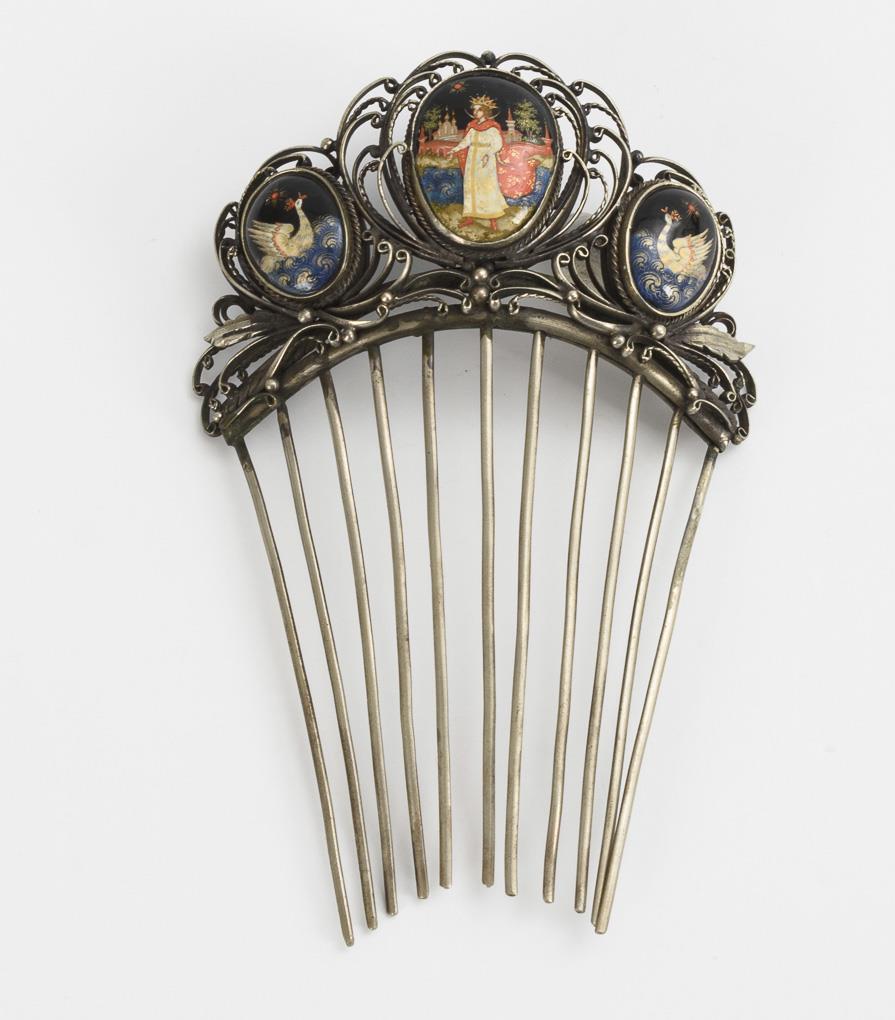 3 tins, 1 metal pin comb with lacquer medallions, 9 brooches and 1 pendant. Mostly with March scenes.