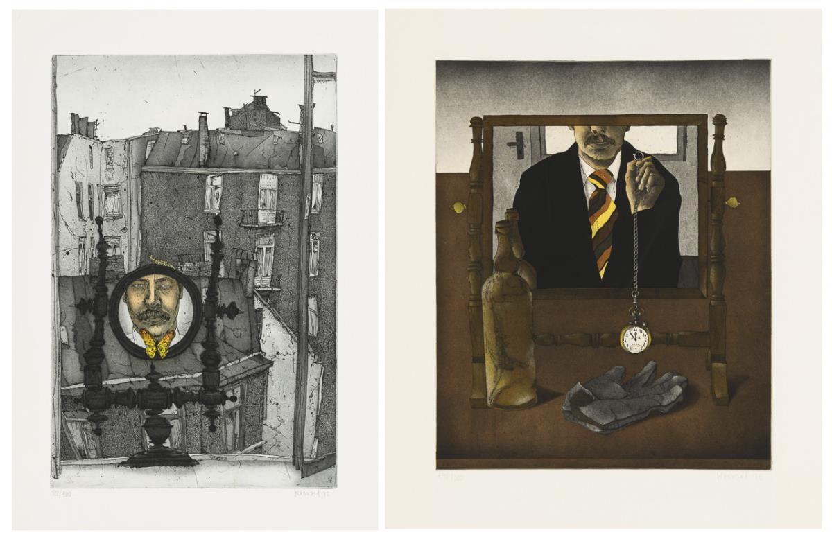Self-portrait in a mirror with pocket watch, copy: 190/300, [19]70, verso stamp "Jahresgabe 1970 Kunstverein Hamburg", printing plate: 47 x 38.7 cm, sheet: 75.5 x 56 cm, some handling marks to margins, soiled on verso | Self-portrait with butterfly, copy: 88/100, [19]76, printing plate: 59 x 39 cm, sheet: 75 x 56.3 cm, some handling and crease marks to margins.