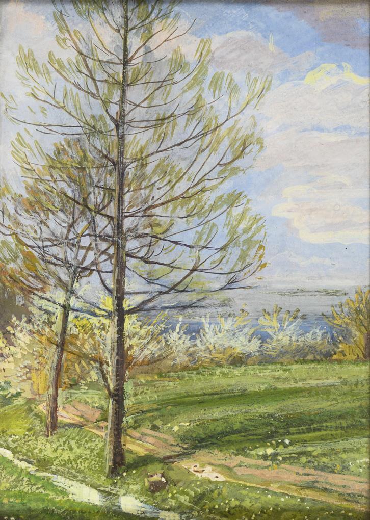 Flowering bushes and slender trees in the sunshine above the coast. WVZ A 37. A defect.