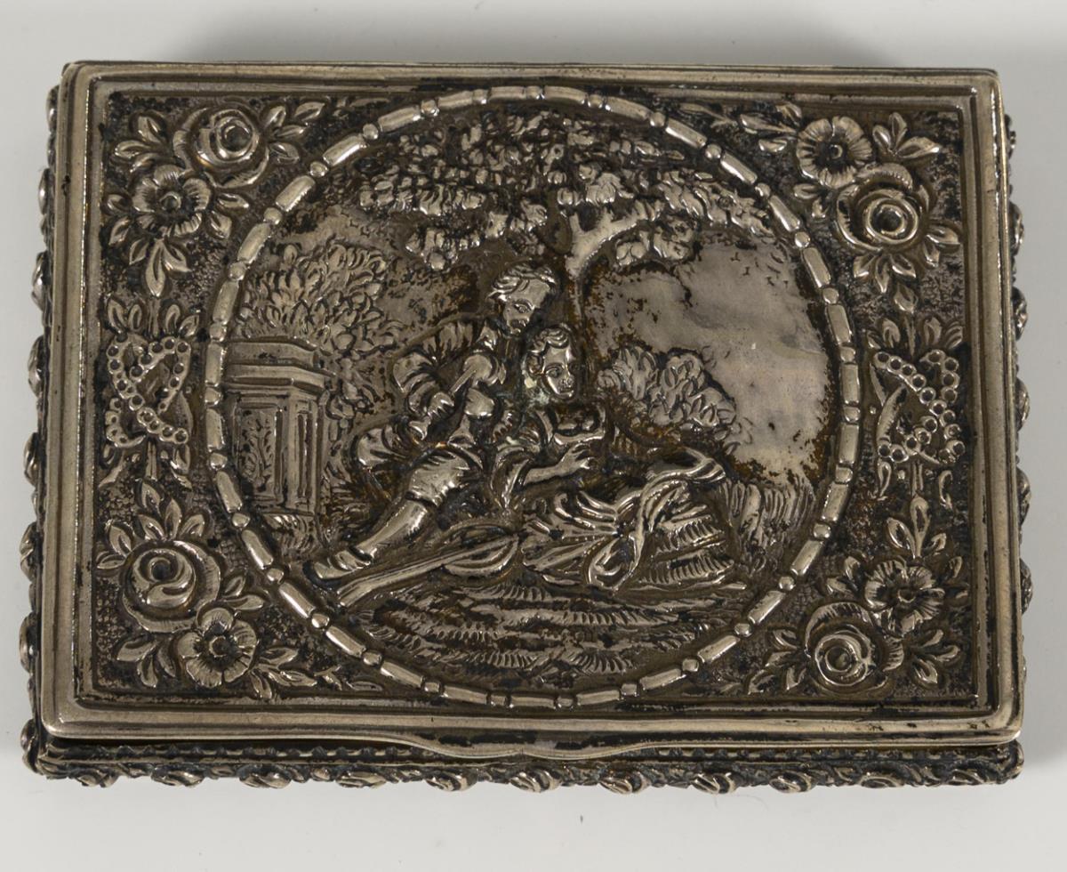 1x oval with dragon slayer on the hinged lid (Gebrüder Dingeldein, Hanau hallmarked). 5,5 x 5 cm, 53 g. / 1x rectangular with shepherd scene on the hinged lid, gilded inside (crescent/crown/800 hallmarked). 8 x 6 cm, 91 g.