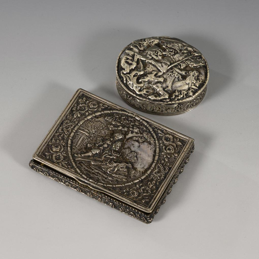1x oval with dragon slayer on the hinged lid (Gebrüder Dingeldein, Hanau hallmarked). 5,5 x 5 cm, 53 g. / 1x rectangular with shepherd scene on the hinged lid, gilded inside (crescent/crown/800 hallmarked). 8 x 6 cm, 91 g.