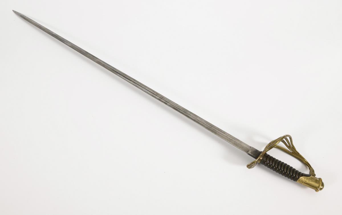 Single-edged blade with double hollow ground to the center of the blade. Ribbed horn handle, three-barrel brass hilt with laurel relief decorations.