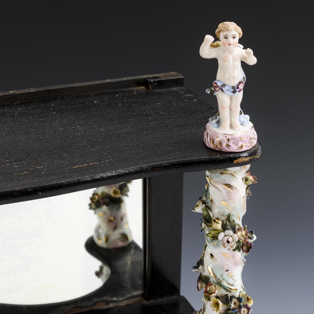 Small shelf with mirrored back, porcelain columns with floral covering and two small putti. Distresses on the covering, mirror with small blind spots.