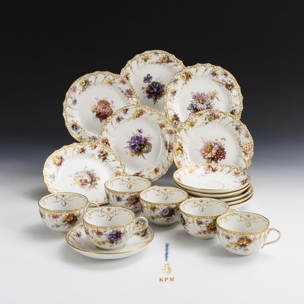 Polychrome painted, gold decorated. 6 tea cups (h 5,5 cm), 6 original saucers (Ø 15,5 cm), 6 cake plates (Ø 18 cm).
