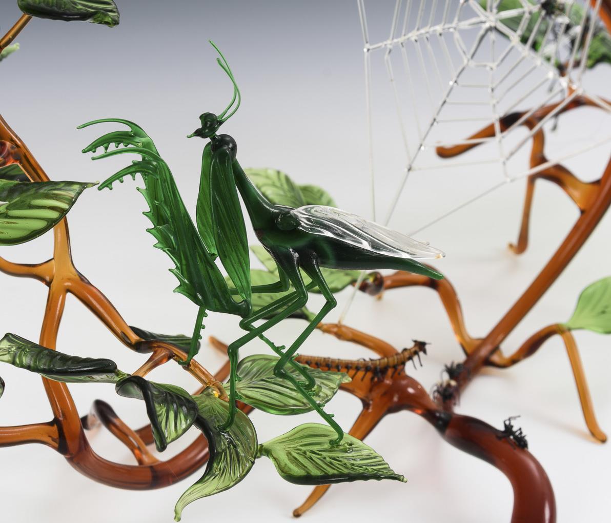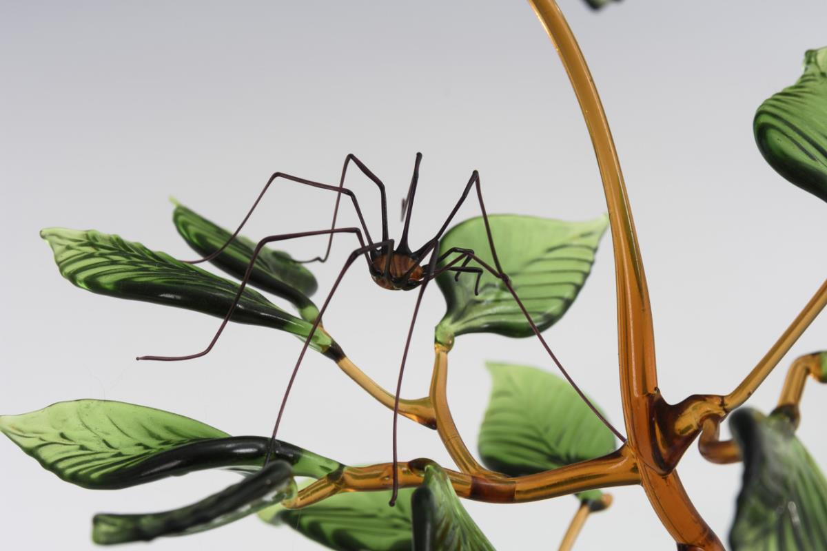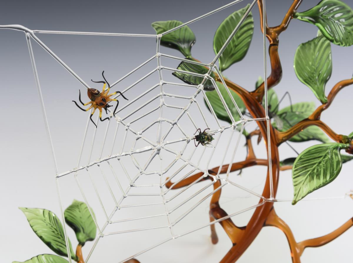 Filigree worked object with a large, leafy branch, sitting on it various insects (including locust, weaver, ants), between the branches a spider web with spider and fly. 1 ant loose.