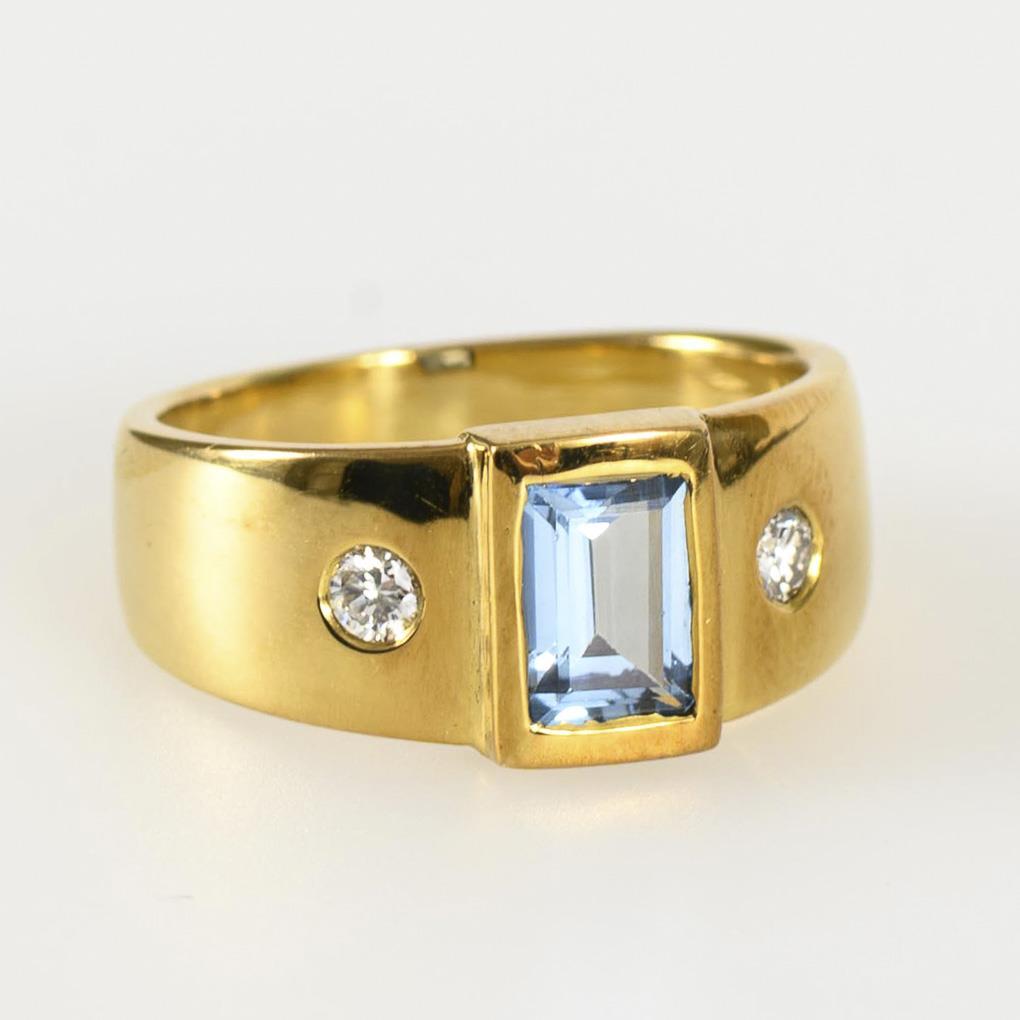 Yellow gold 585 stamped. Diamonds total approx. 0.14 ct/white/high clarity. Ring size 54. 7.6 g.
