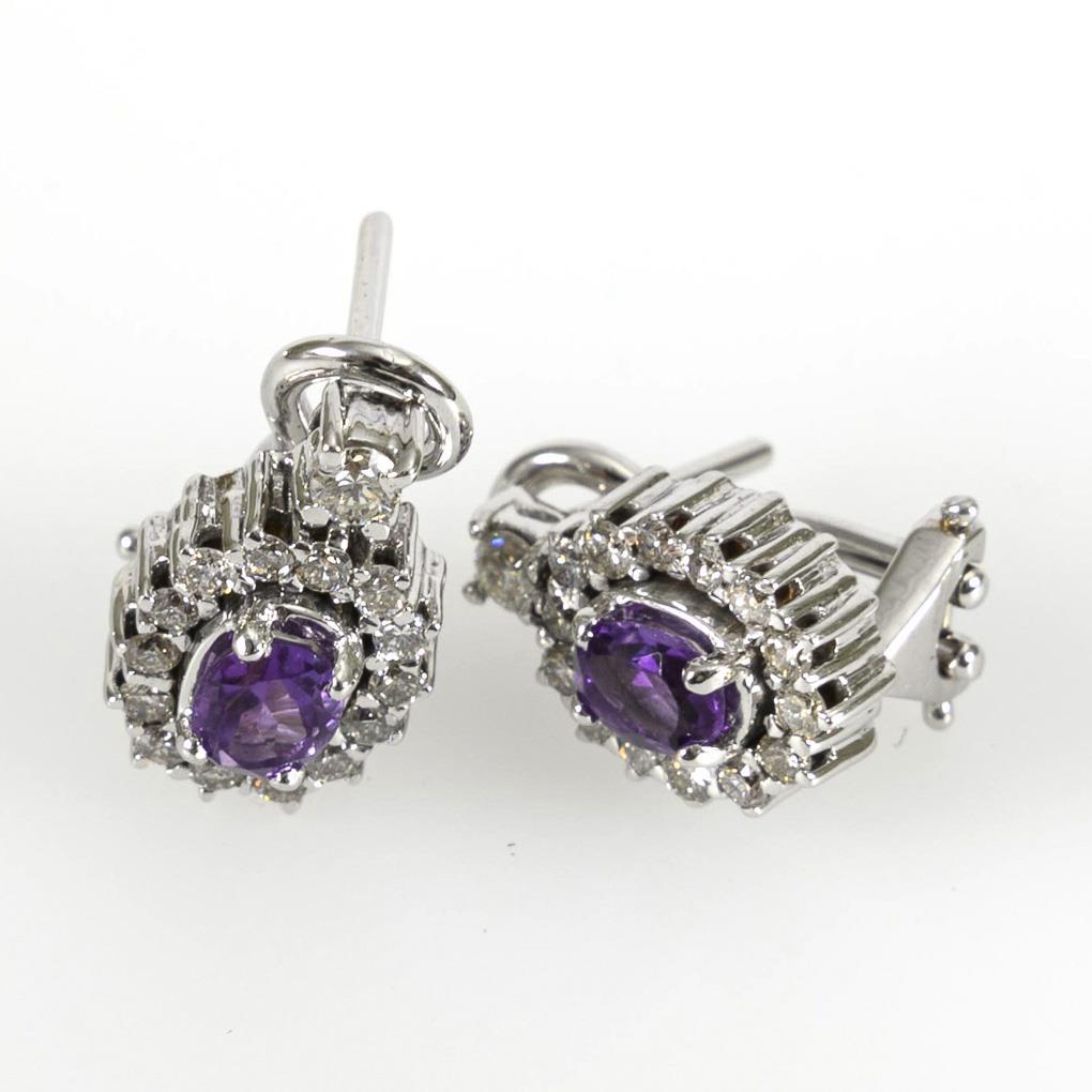 White gold 750 stamped. Amethysts zus. ca. 0,40 ct. Diamonds zus. ca. 0,76 ct/toned white/si-PI. Stud earrings 1,35 x 0,85 cm. 7,2 g.