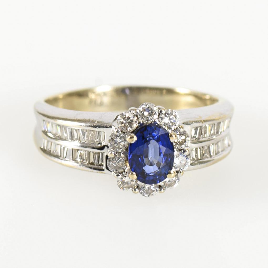 White gold 750 stamped. Diamonds total approx. 1.1 ct/white/si-PI. Sapphire approx. 1.0 ct. Ring size 62. 6.1 g.