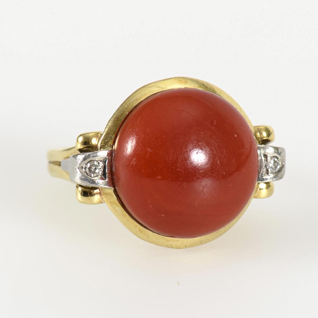 Coral cabochon on openwork ring head, between 2 small inset diamonds and center rail.
