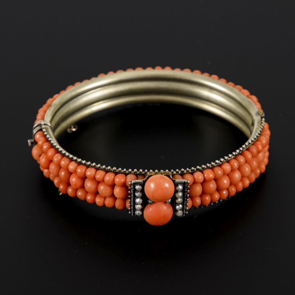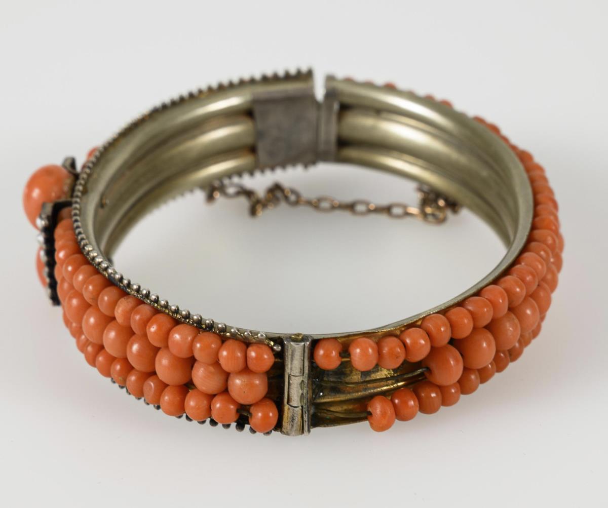 Oval hinged hoop with 3 rows of mounted coral beads. Center mount with 2 coral lenses and seed beads. Box lock with safety chain. About 6 corals missing on the back.