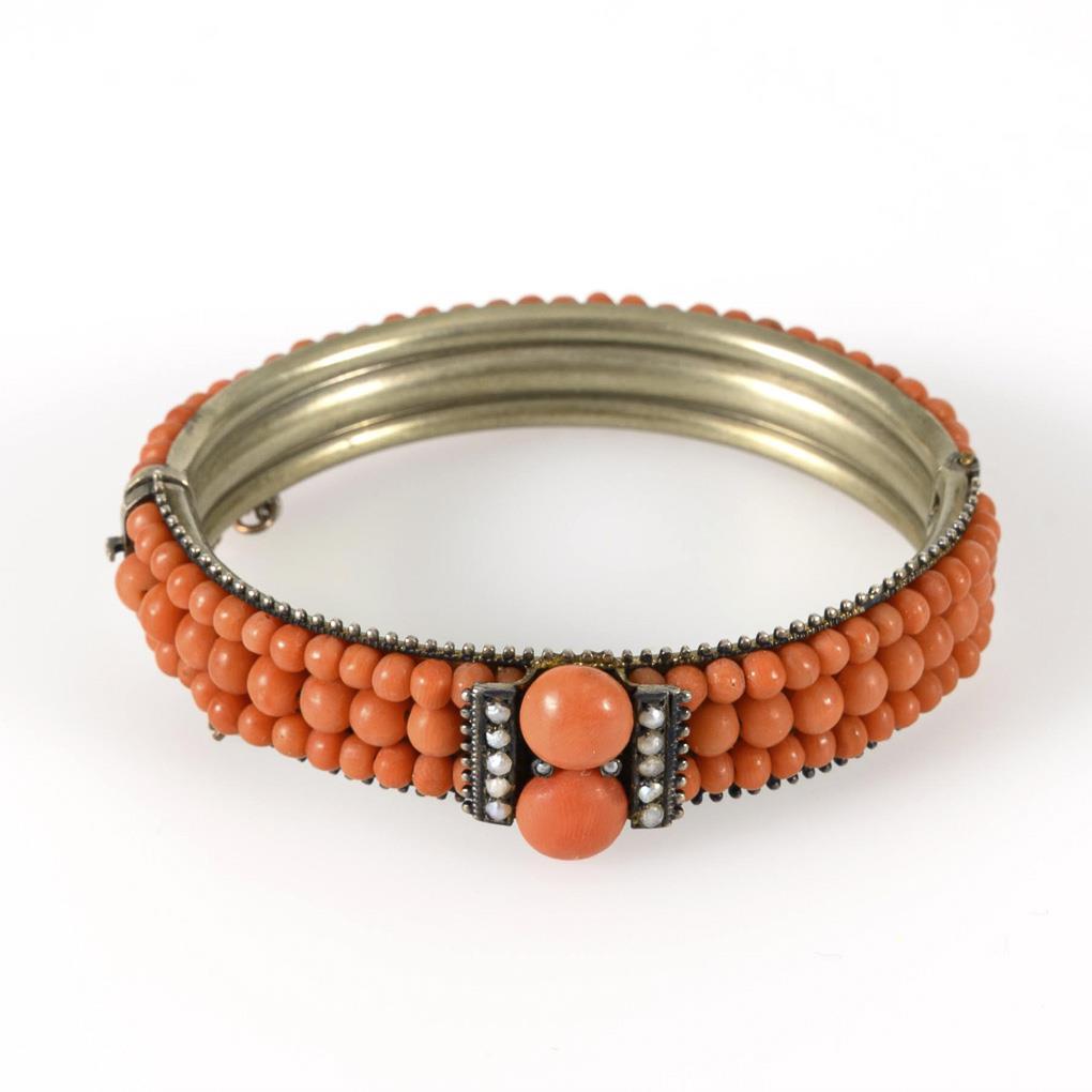 Oval hinged hoop with 3 rows of mounted coral beads. Center mount with 2 coral lenses and seed beads. Box lock with safety chain. About 6 corals missing on the back.