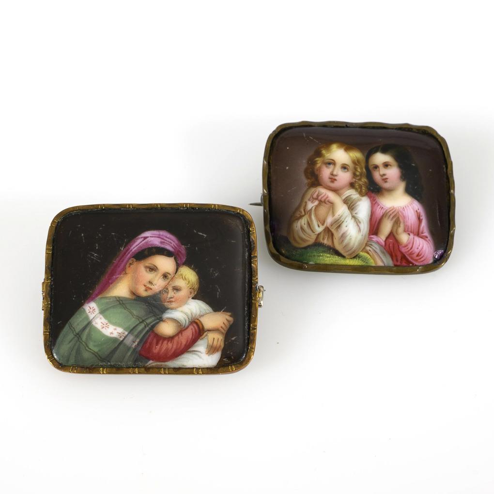 Porcelain plaques with painted motif of Madonna della Sedia after Raphael and praying pair of girls, in open metal frames. Hook and ball hook closure supplemented. Scattered traces of scratches.