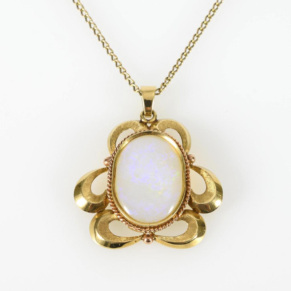Yellow gold pendant 585 stamped. Yellow gold chain 333 stamped. Opal approx. 9.40 ct. 20 x 15 x 5.5 cm. Pendant 4 x 3,5 cm. Chain L 45 cm. Pendant 7,9 g/chain 2,7 g.