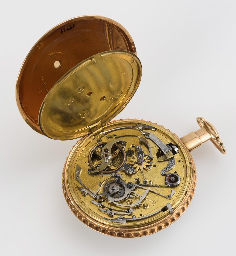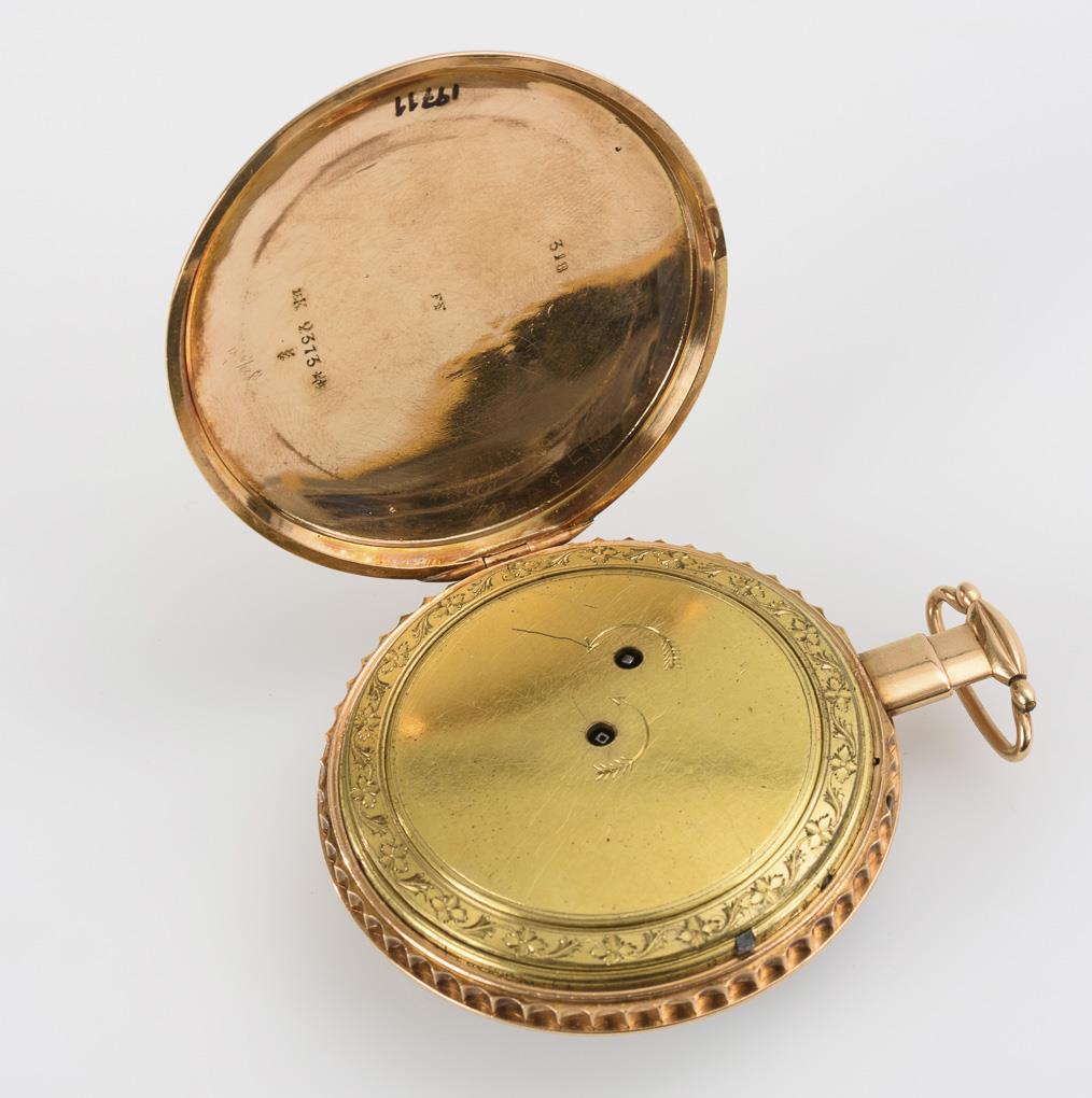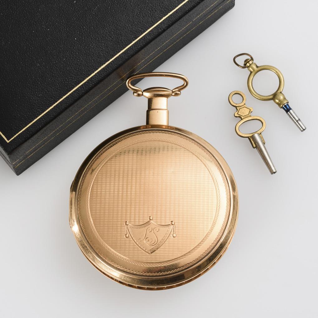 Movement with verge escapement, chain and fusee, engraved wheels, key winding. Watch was in revision in 2011, runs. Striking parts not quite complete, hour strike does not run, quarter strike works. White enamel dial ring with Arabic numerals and minute crown, blued Breguet hands, open leaf center with view of gear train.