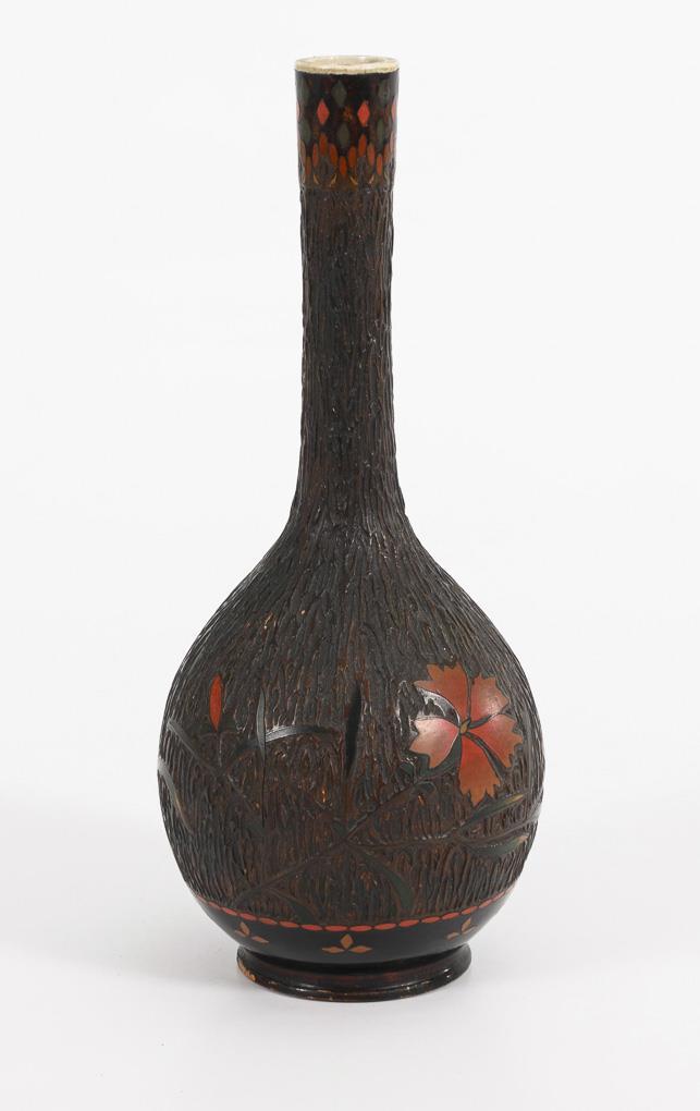 Bellied vase with thin neck. Finch between carnations, in restrained color on rough surface with bark structure.